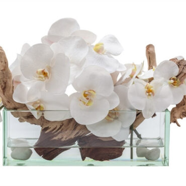 Macetero de Placa de Cristal Casa Moderna de 12" con orquídeas Phalaenopsis blancas, madera de vid tratada con chorro de arena, piedras blancas y nuestra agua de imitación. La impresionante vista de una orquídea Phalaenopsis en plena floración es nada menos que sobrecogedora. Sus enormes y curvados pétalos saturados de color; dobles hileras de preciosas flores desfilan a lo largo de tallos grácilmente arqueados que se elevan como un Fénix desde