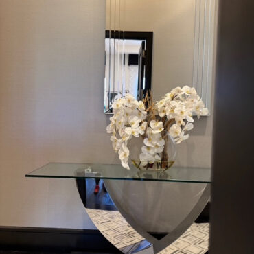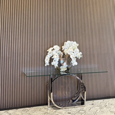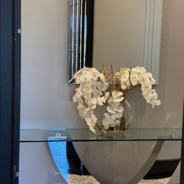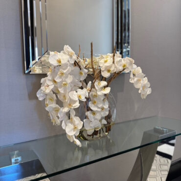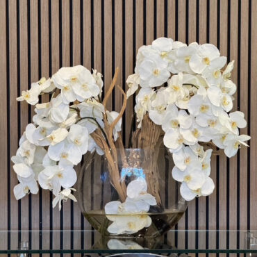 Jarrón Luna de 16" con múltiples tallos de orquídeas Phalaenopsis blancas, madera fantasma tratada con chorro de arena y nuestra agua de imitación. Medidas Jarrón 16"L x 6"A x 13"H Total 26"L x 8"A x 26"H