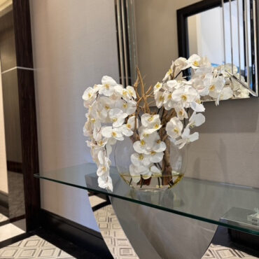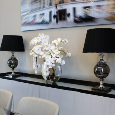 16″ luna jarrón con blanco orquídeas