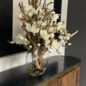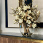 Uno de nuestros jarrones de cristal más populares, nuestro jarrón Luna de 16″ con múltiples tallos de flores de magnolia, follaje y madera fantasma tratada con chorro de arena, anclado en nuestra agua de imitación. Disponible en melocotón o blanco. Disfrute de hermosas y realistas ramas de magnolio que no se marchitarán cuando despierte la primavera. Exhibidas aquí en un elegante macetero de cristal transparente, las flores de magnolia