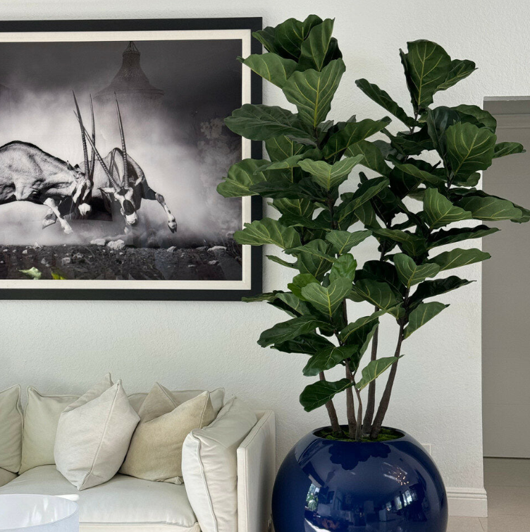 Nuestro jarrón esférico de fibra de vidrio presenta una forma simple y esférica con un toque moderno. Su diseño es la combinación perfecta de estilos tradicionales y contemporáneos, complementando sin esfuerzo cualquier ambiente, ya sea en el hogar o en la oficina. La fusión del jarrón esférico con la higuera de hoja de violín crea una exhibición cautivadora de elegancia contemporánea y follaje vibrante. Esta llamativa combinación une líneas modernas y elegantes con hojas verdes frondosas. La gran escala de este arreglo lo hace ideal para hogares espaciosos con techos altos y mucho espacio para exhibir su belleza con precisión.