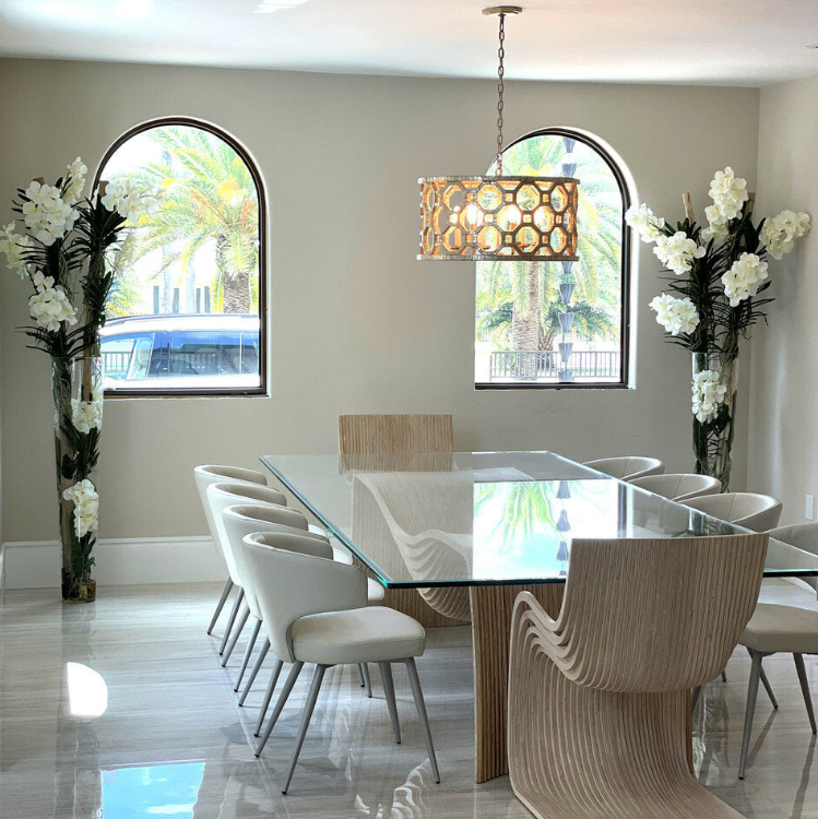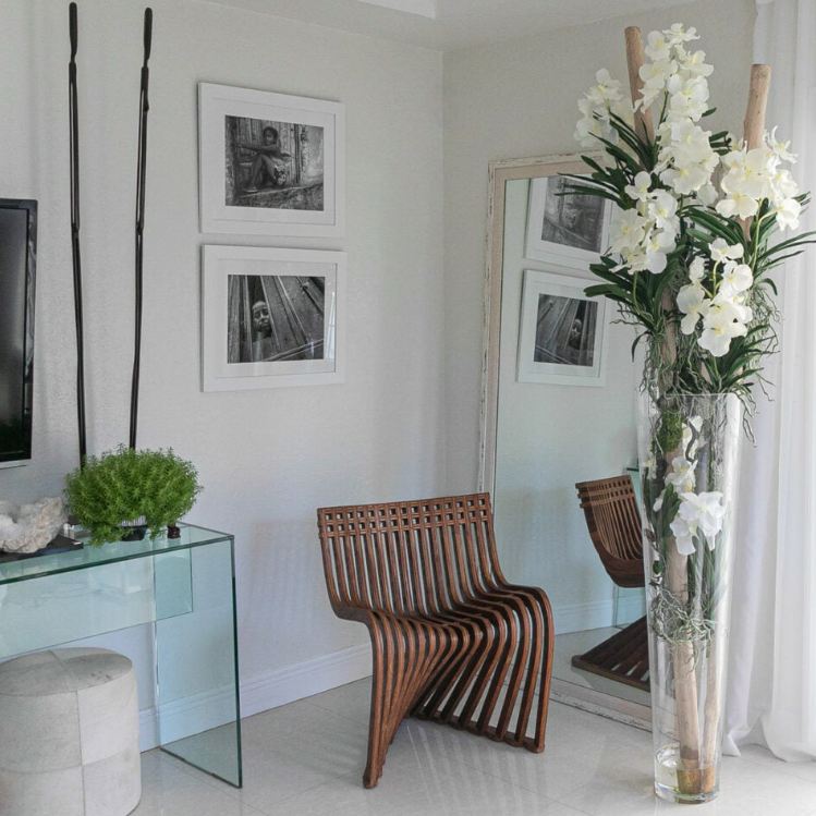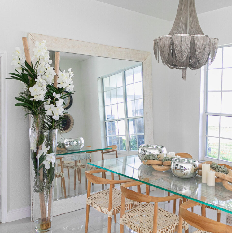 De generoso tamaño, frondoso y abundante, este arreglo presenta hojas anchas y realistas fijadas a una pieza de madera flotante natural de California. Para realzar su belleza, todo el arreglo se coloca dentro de un gran jarrón cónico de vidrio hecho a mano. Su vidrio translúcido y transparente acentúa el realismo de esta pieza destacada.