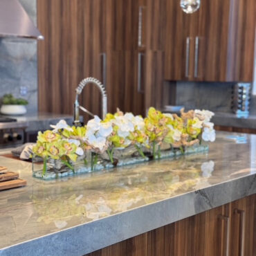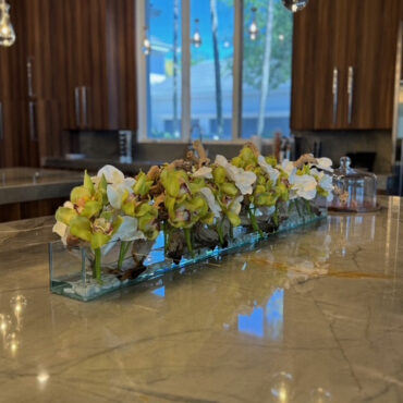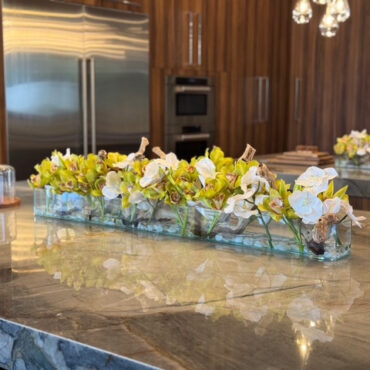 Nuestro popular macetero de cristal Casa Moderna con un arreglo de cimbidios verdes, vandas blancas y madera de vid tratada con chorro de arena, anclado en nuestra agua de imitación. Esta combinación de colores sutiles añadirá un toque de elegancia y sofisticación a cualquier decoración, ya sea moderna o contemporánea. Tamaños Disponibles: 24", 36" y 48" de Largo Altura y Profundidad del Macetero: 4" de Alto