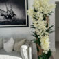 Un jarrón de teca de 20" de diámetro x 60" de alto, de belleza natural y con un sutil acabado natural, combinado con exóticas orquídeas vanda blancas y hojas. Esta increíble pieza única es verdaderamente una obra de arte. Diseñadas con la Madre Naturaleza en mente, e imitando su apariencia real, estas flores están cuidadosamente colocadas a lo largo de este texturizado
