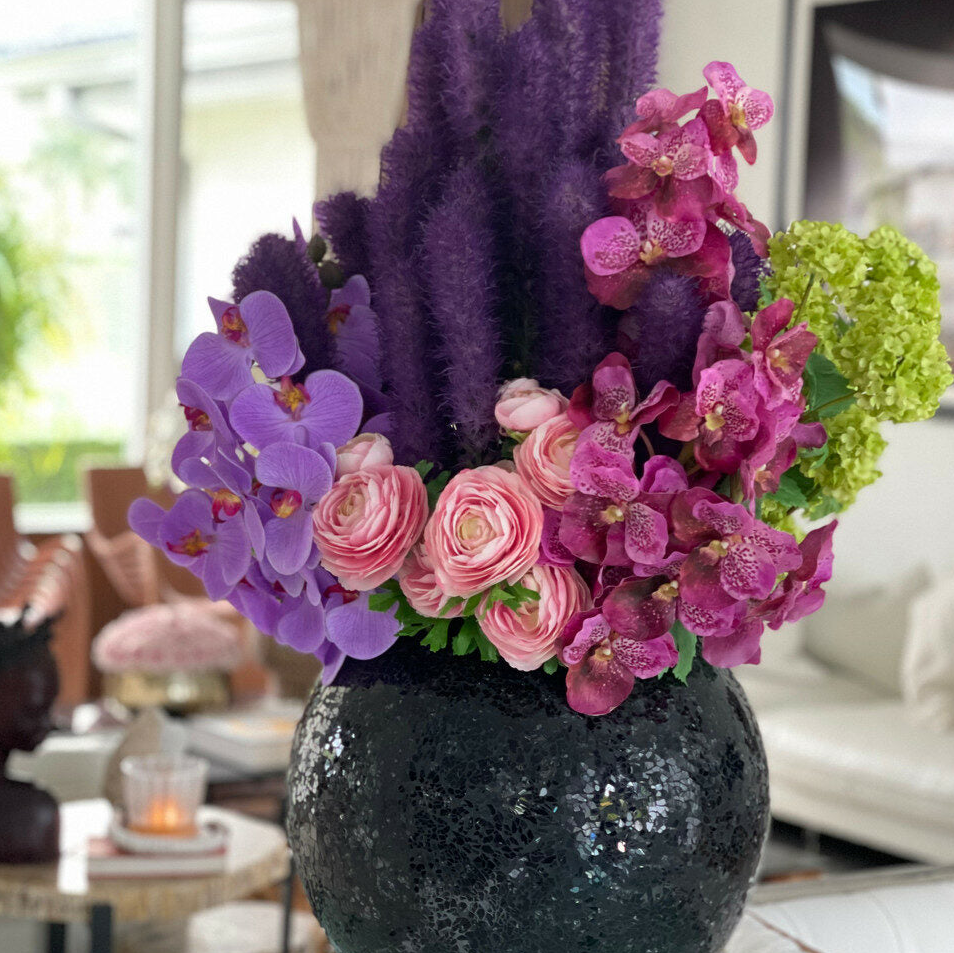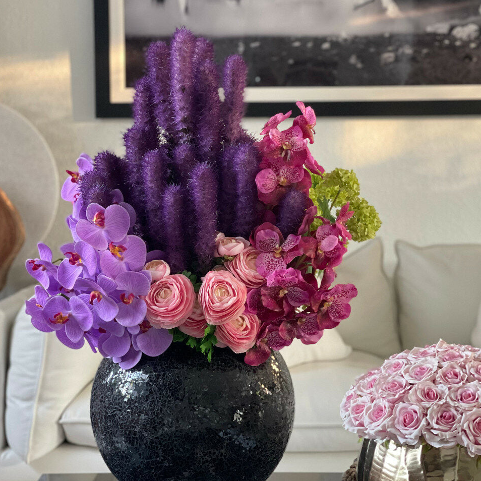 Un exuberante e impresionante ramo de flores de "tacto real" es el protagonista de nuestro Jarrón de Mosaico Negro. Este llamativo jarrón redondo está elaborado con cientos de piezas de cristal de mosaico negro, meticulosamente dispuestas. La atractiva selección floral presenta liatris morados mezclados con orquídeas mokara fucsias, orquídeas phalaenopsis y orquídeas vanda, acentuadas por ranúnculos rosas y hortensias bola de nieve verdes.