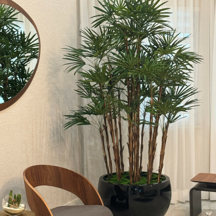 Una palmera elegante para espacios que necesitan un toque natural, la refinada Lady Palm en nuestro jarrón Terragona negro brillante presenta múltiples troncos delgados coronados con hojas que parecen pequeños parasoles verdes. Las hojas superiores están ligeramente desplazadas de las inferiores, creando un aspecto frondoso y en capas con muchos frondes visibles a la vez. Esta pieza combina un estilo formal pero tropical, añadiendo un toque de elegancia a cualquier habitación de tu hogar.